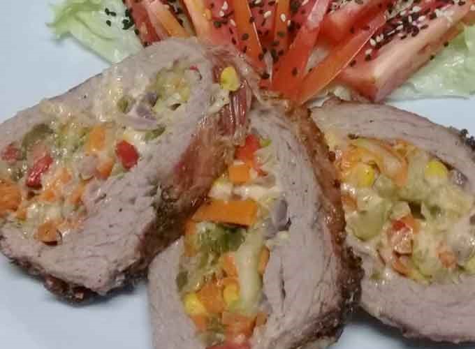 Karotten, Zucchini, grüne und rote Paprikaschoten sowie Zwiebel in kurze 0,5 cm dicke Streifen schneiden. In einer Pfanne 100 ml Olivenöl erhitzen und das Gemüse darin 5 - 7 Minuten bei mittlerer Hitze dünsten. Das Gemüse aus dem Öl nehmen, den abgetropften Mais dazugeben, etwas salzen und abkühlen lassen. In das Roastbeef an der Längsseite eine Tasche schneiden. Mit dem Gemüse füllen und das Fleisch mit Küchengarn gut zunähen.