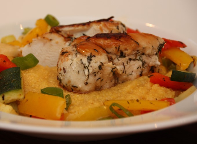 Anschließend 2 EL Butter in einer Pfanne schmelzen, Hähnchenbrustfilets aus dem Kräuterbad nehmen, mit flüssigem Honig bepinseln und in der Butter bei mittlerer Temperatur kandieren. Dazu passt eine mit Safran gewürzte Polenta und Paprika-Zucchinigemüse. Guten Appetit!