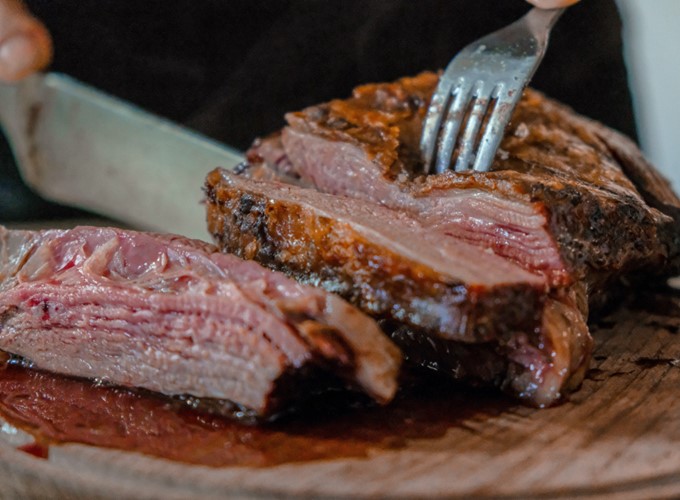 Am Grilltag: Wenige Holzkohlebriketts (zunächst 1 – 1,5 kg) vorglühen lassen und rechts und links an den Rändern des Kohlerostes aufhäufen. So haben Sie 2 Temperaturzonen für langsames, indirektes Grillen. Das Steak in eine feuerfeste Schale in die Mitte des Grills legen und mit Malbec angießen. Bei geschlossener Grillhaube circa 1,5 – 2 Stunden bei circa 140 °C garen lassen. Temperatur halten (dazu neue, durchgeglühte Holzkohlebriketts nachlegen und Luftzufuhr anpassen). Bei 70 - 75 °C Kerntemperatur ist das Fleisch perfekt.