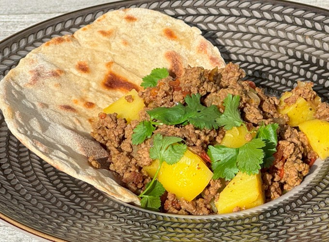 In Südafrika »Roti and Mince« genannt, zeigt dieses Rezept den großen Einfluß Indiens auf Afrikas Küche. Kreuzkümmel, Koriander und Kurkuma geben dem Rinderhack eine exotische Note. Als Beilage serviert Elnette Viljoen selbstgemachtes Roti, dünnes Fladenbrot.